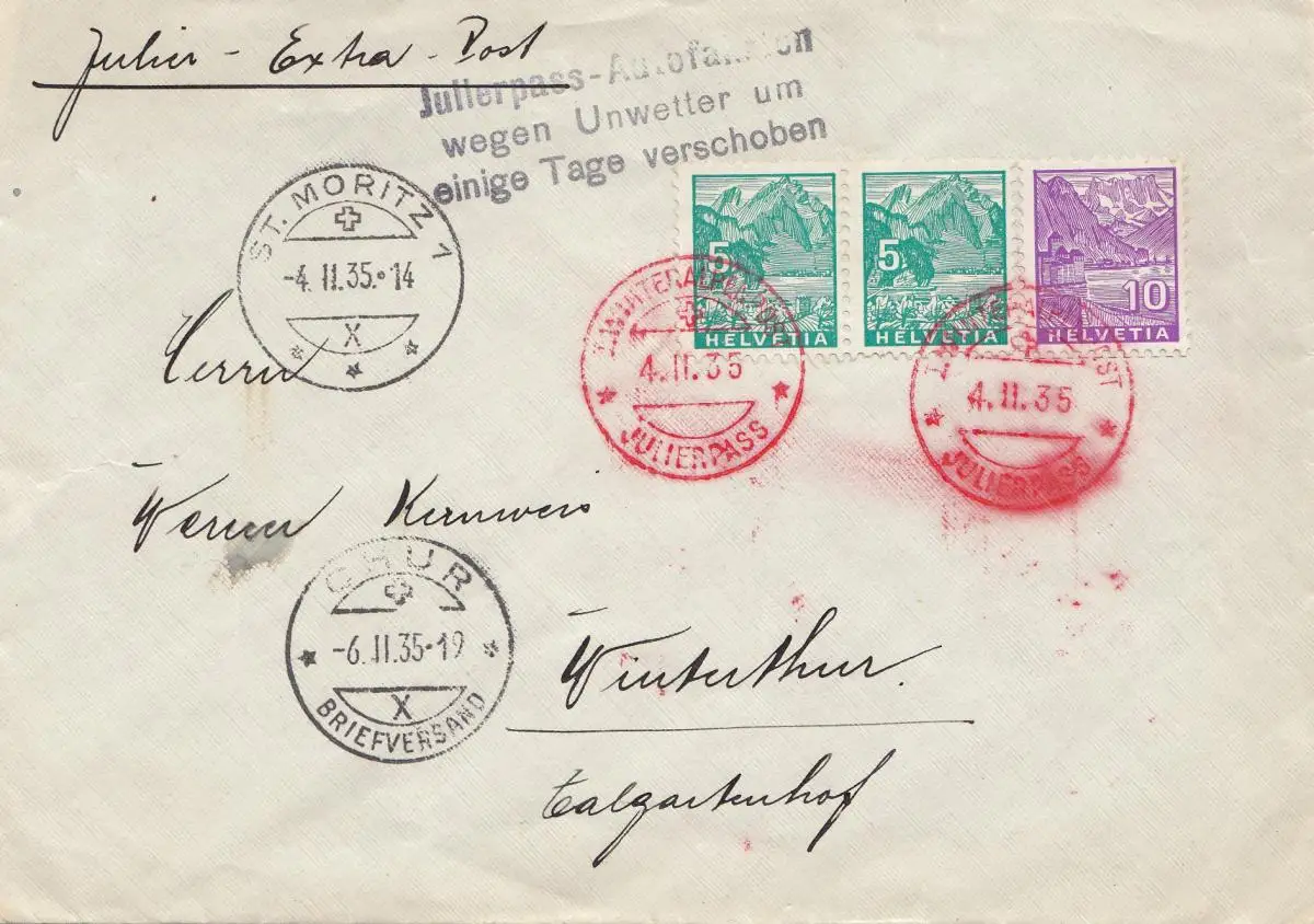 Schweiz: 1935: St. Moritz, Julierpass, nach Winterthur, Pass unpassierbar