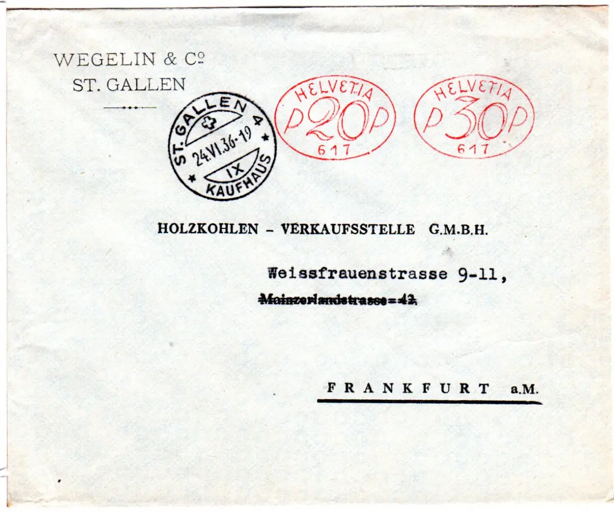 Schweiz 1936, 20+30 C. Maschinenfreistpl. auf Weggelin & C0. Brief v. St. Gallen