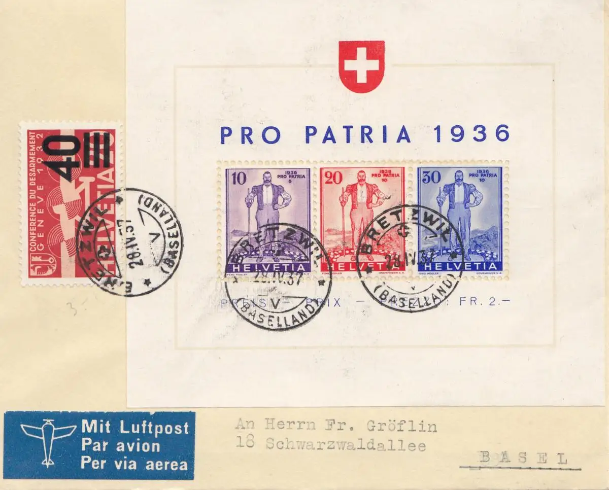 Schweiz: 1936: Pro Patria Bretewil nach Basel, Block 2