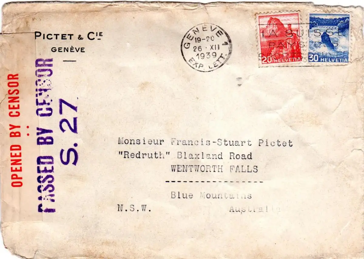 Schweiz 1939, 20+30 C. auf Zensur Brief v. Geneve n. Australien