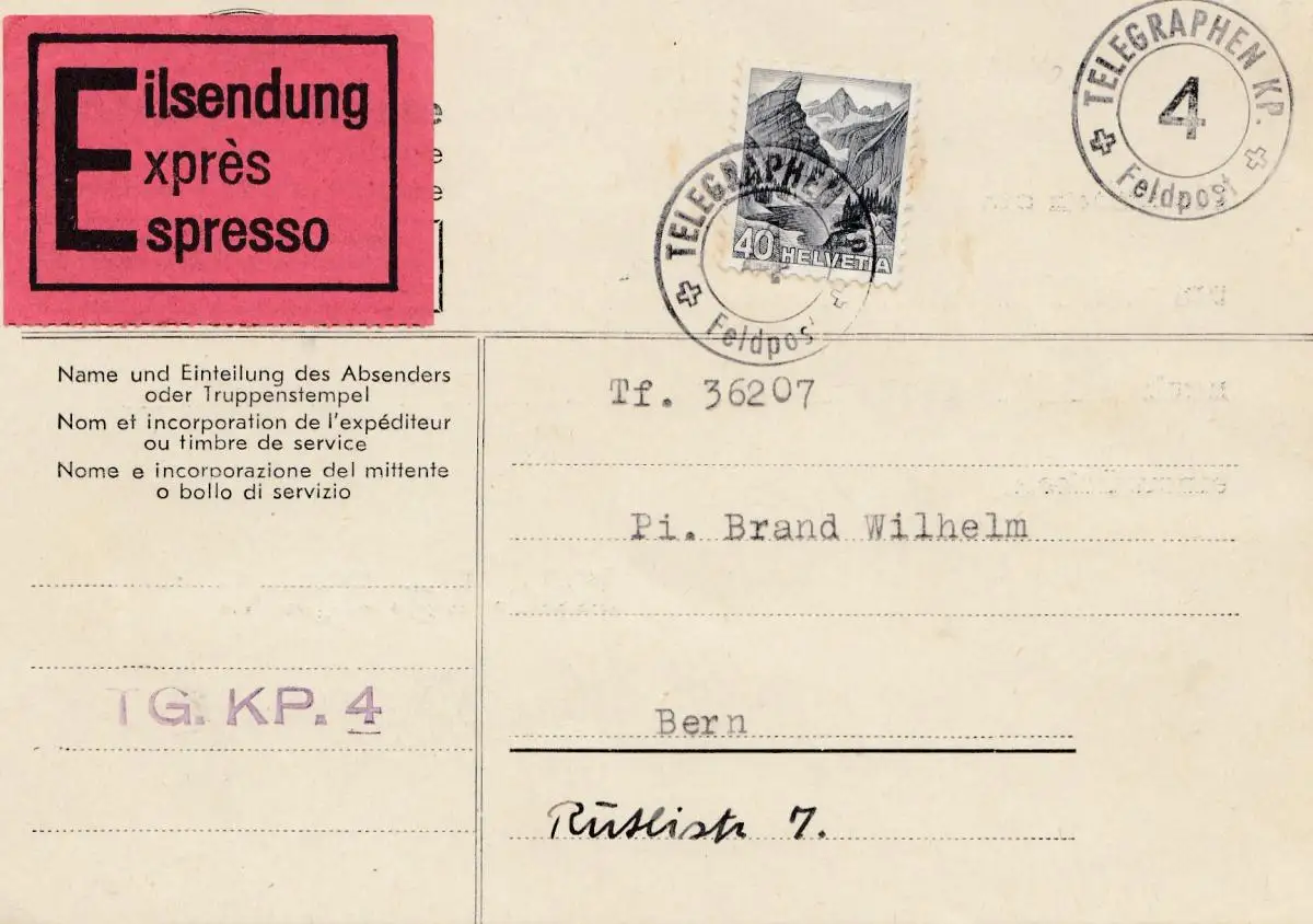 Schweiz: 1940: Eilsendung Telegraphen KP. Feldpost nach Bern
