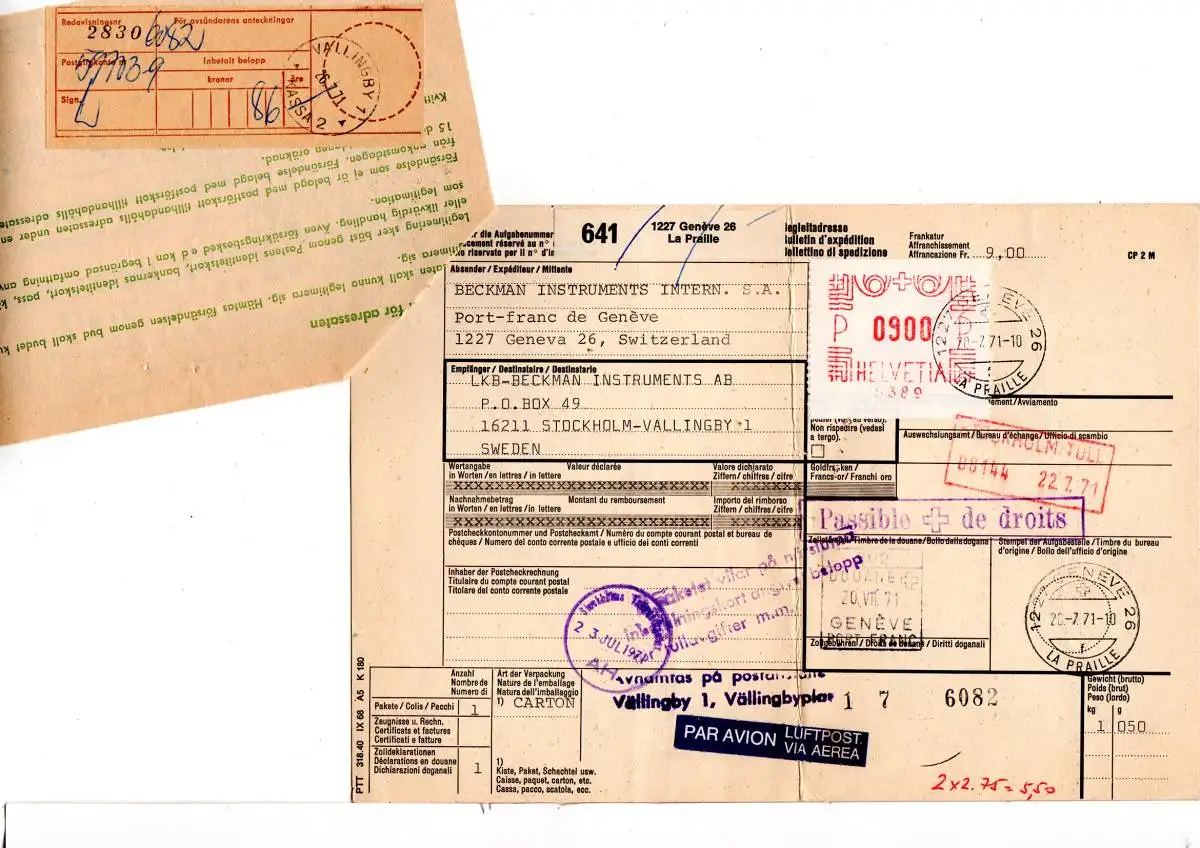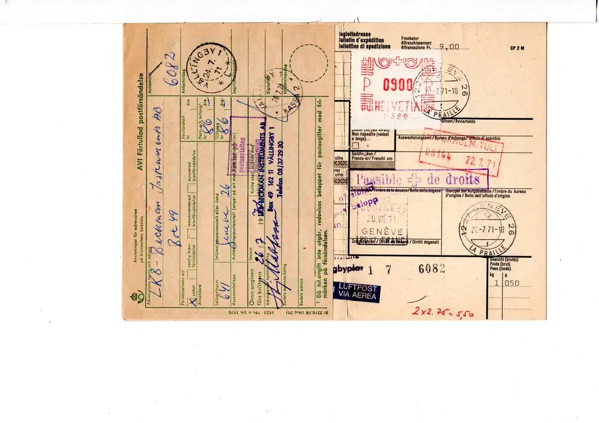 Luftpost Paketkarte (senkr. mittige Faltung, siehe scans) v. Genève La Praille n. Stockholm m. schwedischem Postformular zur Erhebung v. 86 Kronen Post- u. Zollabgaben.