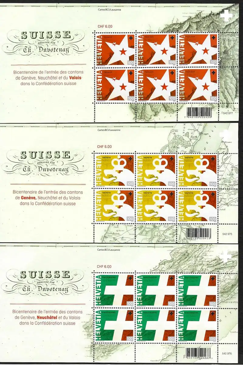 Schweiz 2015: 200 Jahre Aufnahme von Genf, Neuenburg, Wallis, 3x Kleinbogen, **