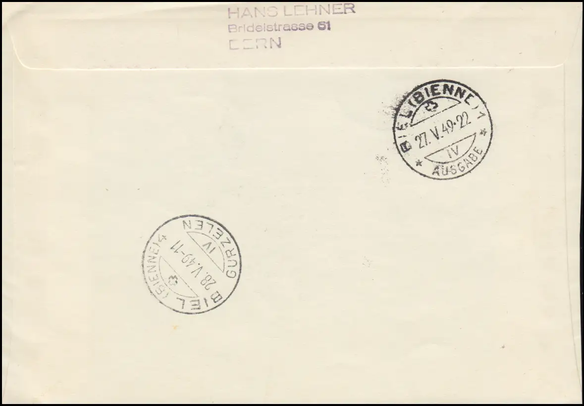 Einschreiben mit Sonder-Einschreibe-Zettel "75 Jahre UPU" nach BIEL AUSGABE 27.5.49 und BIEL-GURZELEN 28.5.49