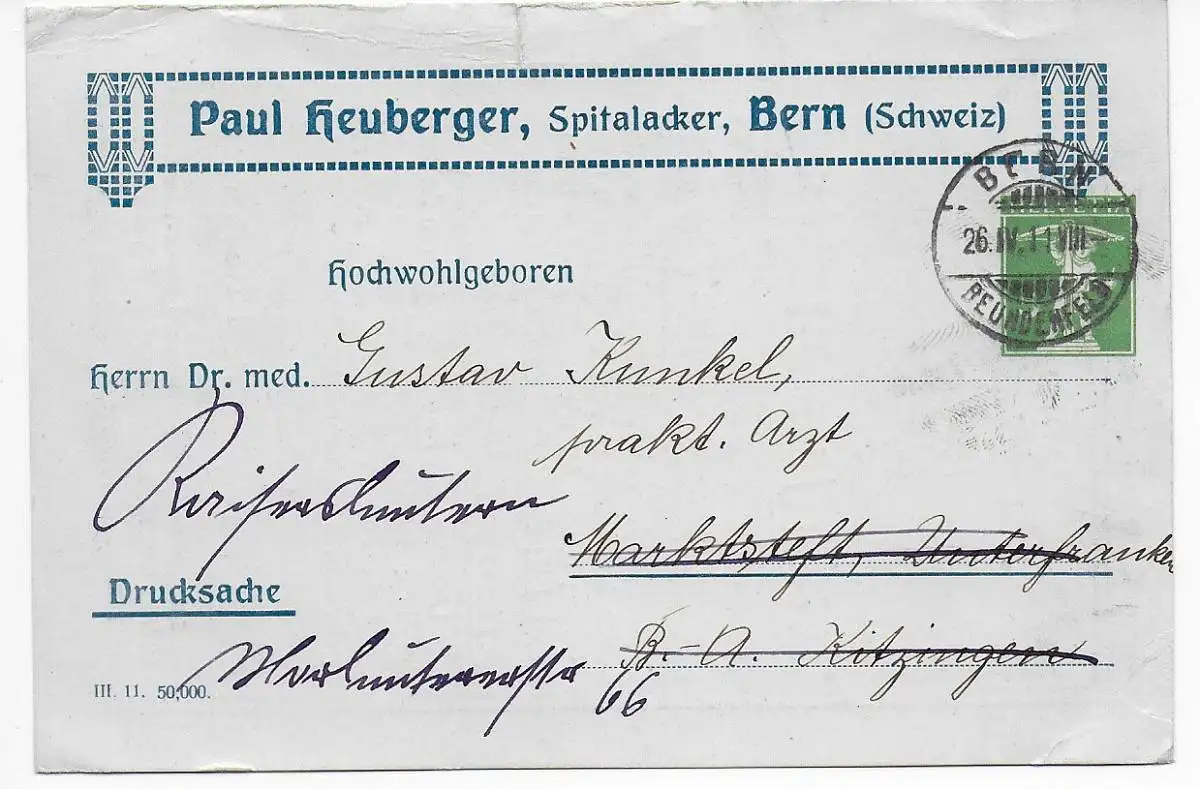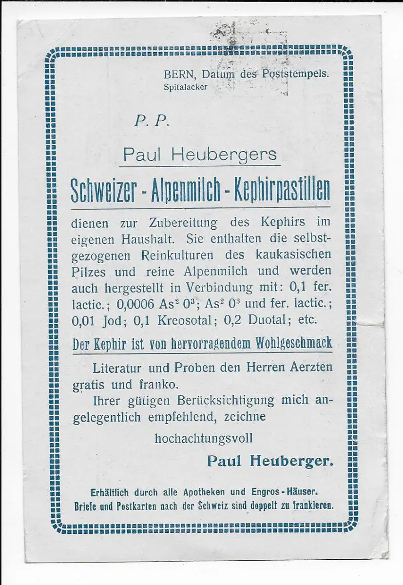 Schweiz: Bern 1910 nach Marktstedt, Drucksache: Heuberger Kephirpastillen