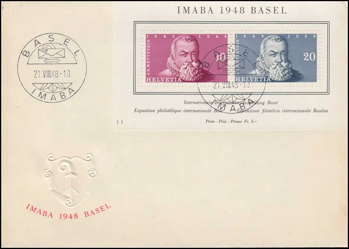 Schweiz Block 13 Ausstellung IMABA 1948 auf Schmuck-FDC ESSt BASEL 21.8.48