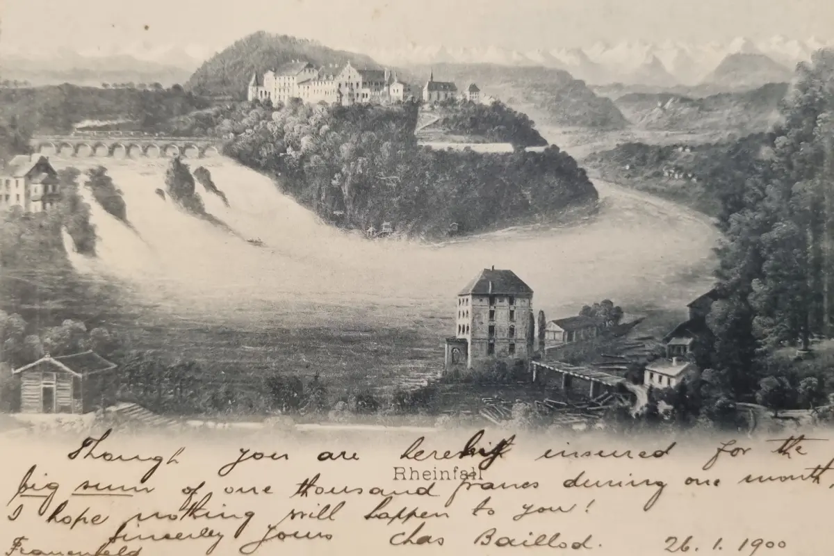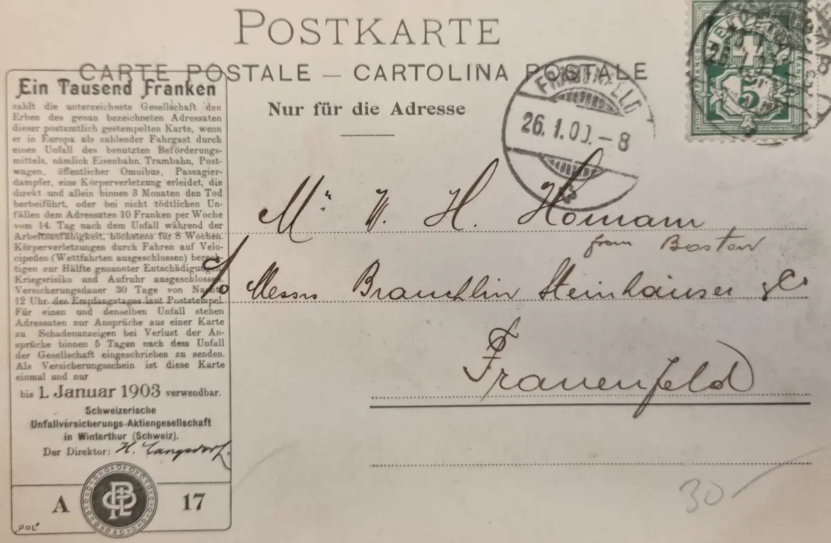 Beschreibung: Schweizer Postkarte mit grüner 5-Rappen-Briefmarke Kreuz und Schild, klar gestempelt „POSTALE 26.1.01“, adressiert nach Frauenfeld. Vordruck „Nur für die Adresse“. Links Werbetext einer Unfallversicherungs-Aktiengesellschaft Winterthur mit Überschrift „Ein Tausend Franken“.