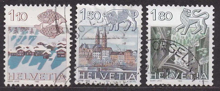 Schweiz, Mi-Nr. 1228, 1230 + 1243 gest., Tierkreiszeichen und Landschaften