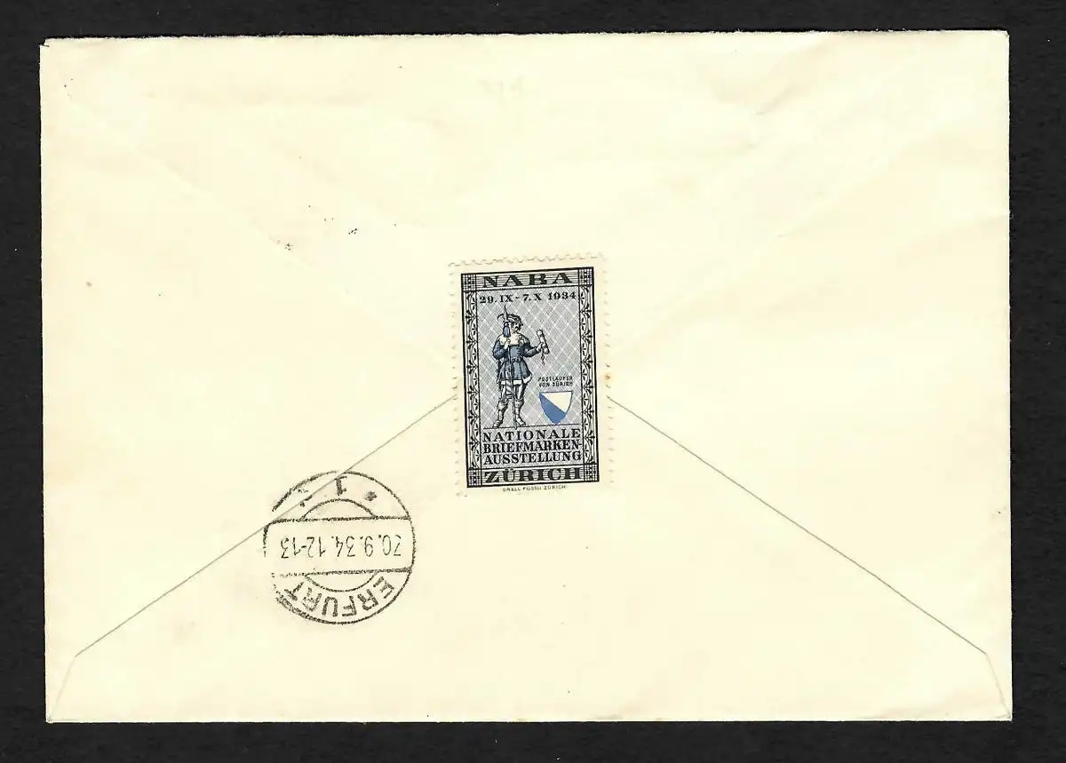 Schweiz: NABA 1934, Einschreiben Block Nr. 1 auf Brief nach Erfurt, Vignette FDC