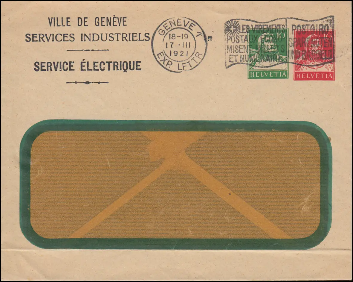 Schweiz Privatumschlag Fensterbrief Tell 10 C. grün + 10 C. rot, GENF 17.3.1921