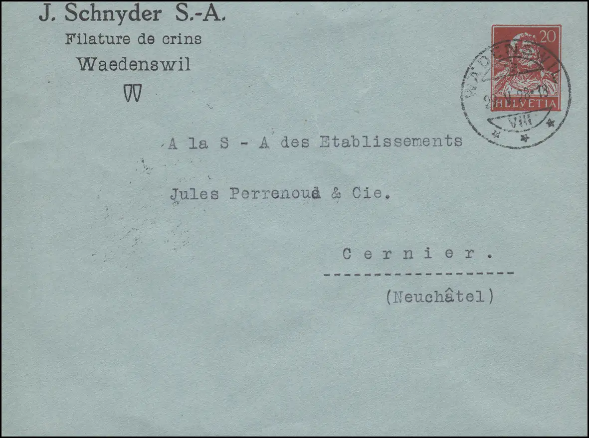 Schweiz Privatumschlag Tellbrustbild 20 C. Filature de crins WAEDENSWIL 29.5.28