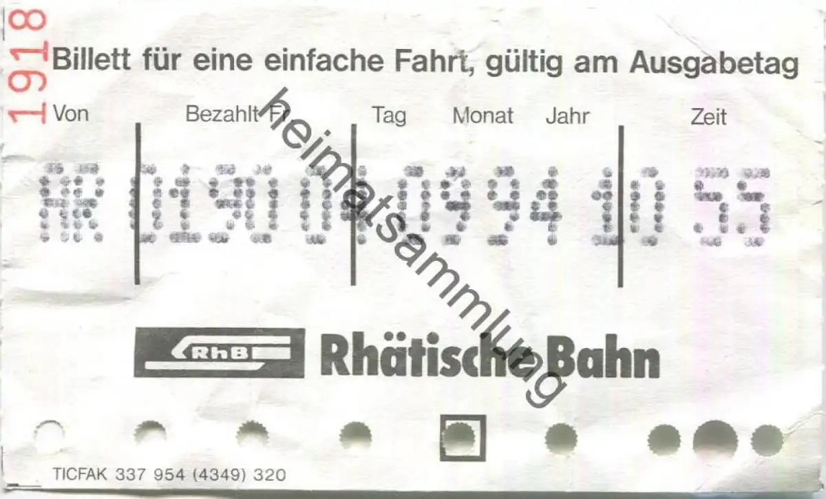 Schweiz - RhB - Rhätische Bahn - Billett für eine einfache Fahrt - Fahrkarte 1994