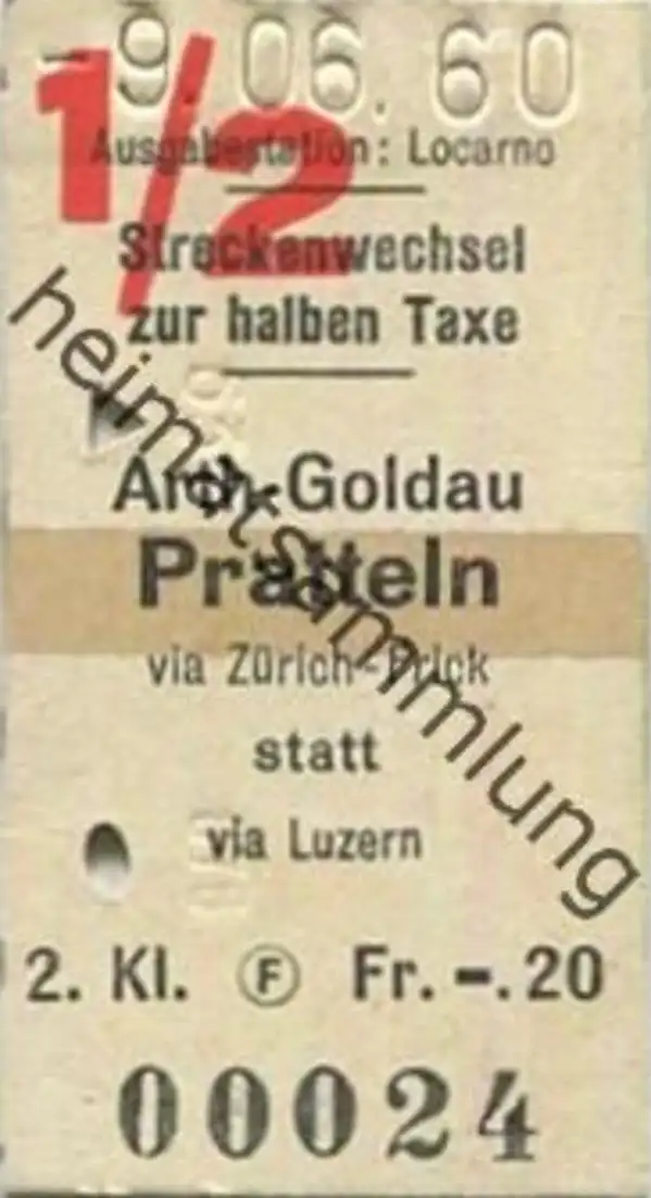 Schweiz - Streckenwechel zur halben Taxe 1960 - Arth-Goldau Pratteln via Zürich-Frick statt Luzern - Fahrkarte 2. Klasse Fr. -. 20 (G55839)