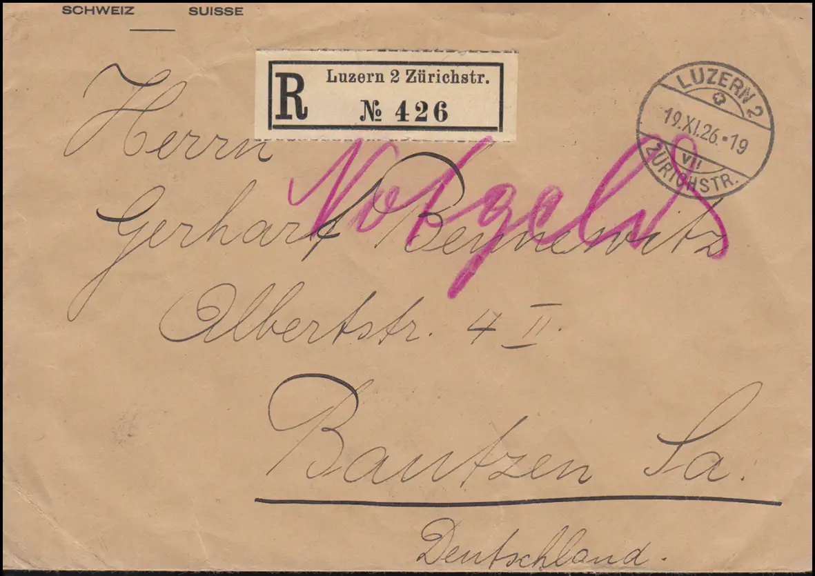 Drei Zusammendrucke und Einzelmarke rückseitig auf Einschreiben nach Deutschland: Ankunftsstempel BAUTZEN 20.11.26.