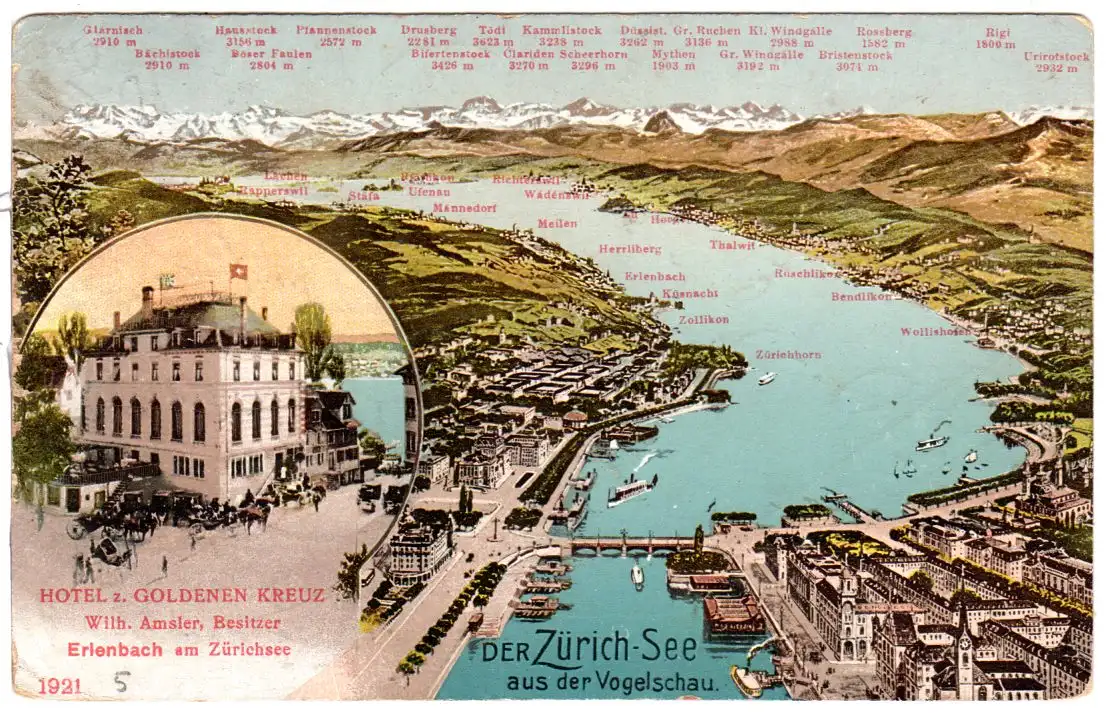 Schweiz, Zürich-See u. Hotel z. Goldenen Kreuz, 1907 gebr. Farb-AK