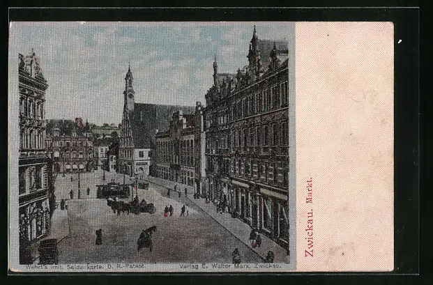 Seiden-Imitations-AK Zwickau, Markt mit Strassenbahn