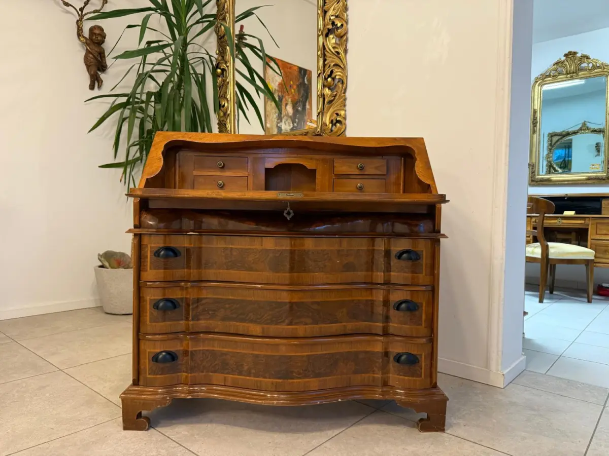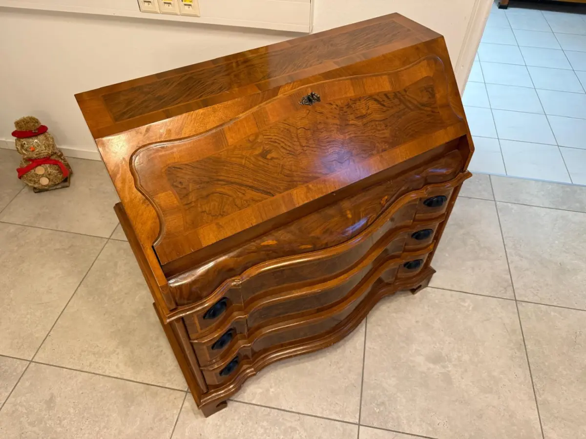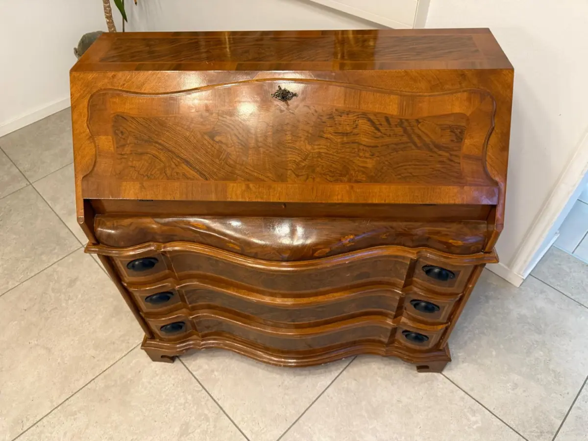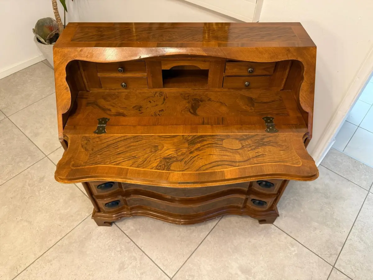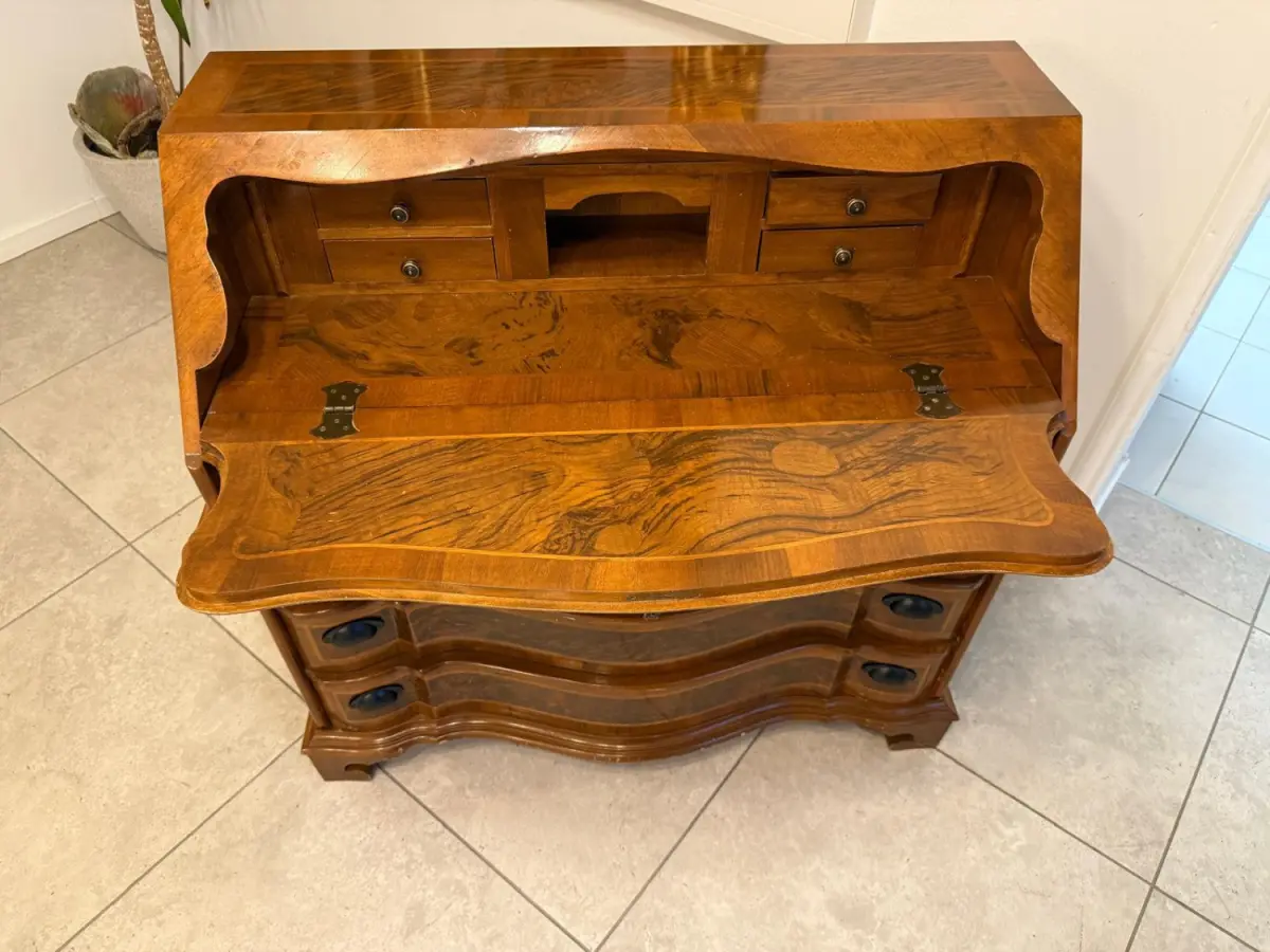 Zum Verkauf steht ein sehr hübschen stilvoller Sekretär im Stile des Barocks aus der Zeit um 1980 mit hübschen Intarsien / Marketerien und Wurzelholzmaserung!