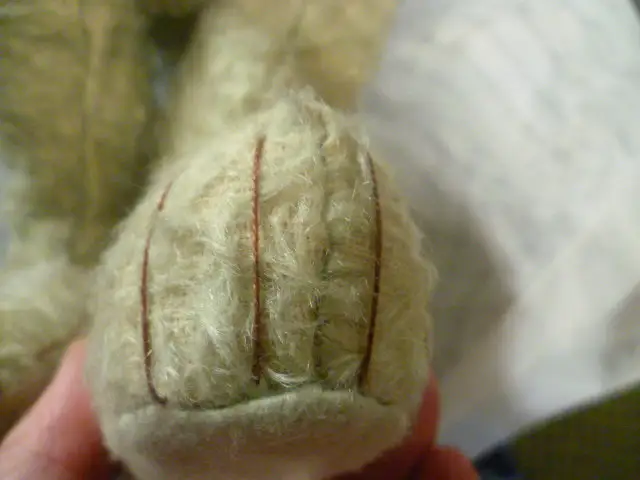 Der Teddybär hat eine sehr lange, spitze Schnauze und typisch großen Buckel. Lange Arme und Beine..