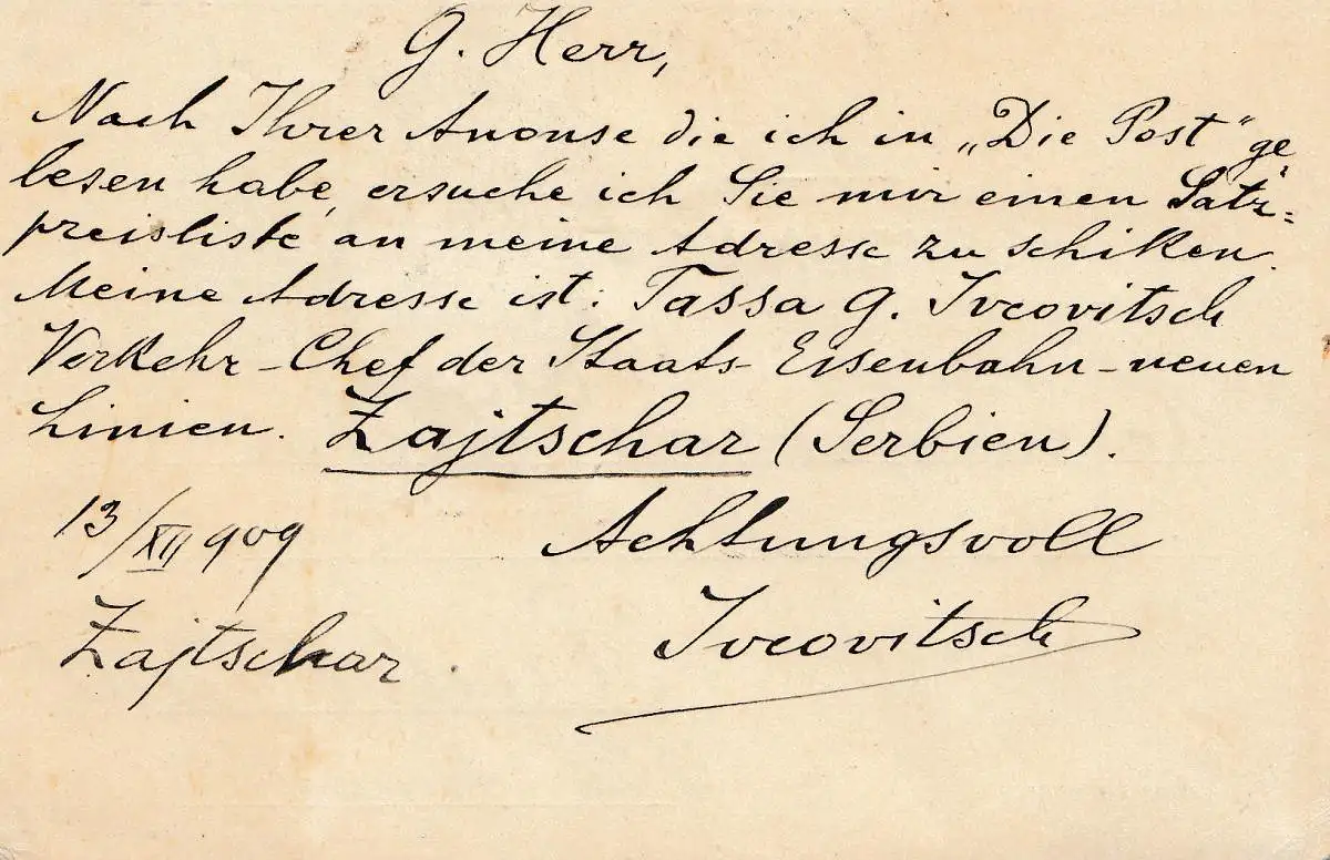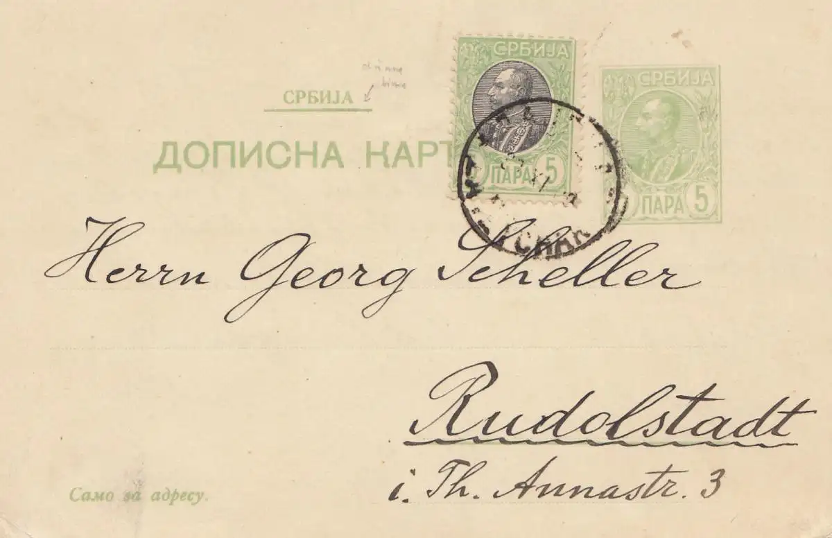 Serbien: 1909: Ganzsache nach Rudolstadt