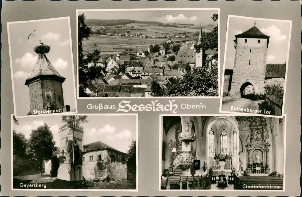 Seßlach Mehrbild-AK mit Storchennest, Geyersberg, Pfarrkirche uvm. 1965
