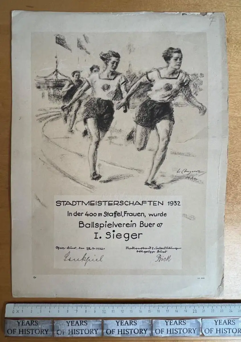 Sieger Urkunde 1932 Stadtmeisterschaften 400 m Frauen Staffel Gelsenkirchen Buer