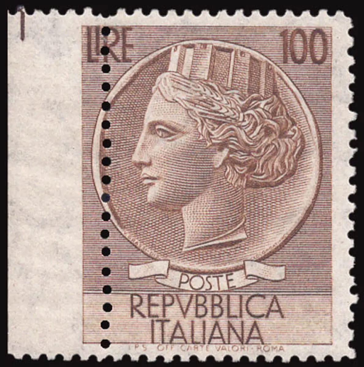 MNH - Vollgummi - Syrakus Lire 100 Nr. 785fc linke Verzahnung stark nach rechts pro mm verschoben. 3 (Blattrand) - Selten - Kat. euro 450 Cod. 789/17