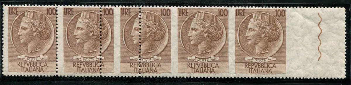Siracusana Lire 100 stelle II dent. 13,1/4 wunderschöne Sorte Vollgummi - Syrakus Lire 100 Sterne II Verzahnung 13,1/4 Nr. 785/I Fünf-B.-Streifen von f. - Die erste Normalmarke, die zweite mit rechtsverzahnte Verzahnung in die Mitte verschoben, die dritte mit linker Verzahnung in die Mitte verschoben, die vierte und fünfte nicht senkrecht gezähnt - Edle Sorte noch nicht katalogisiert Cod. 648/13