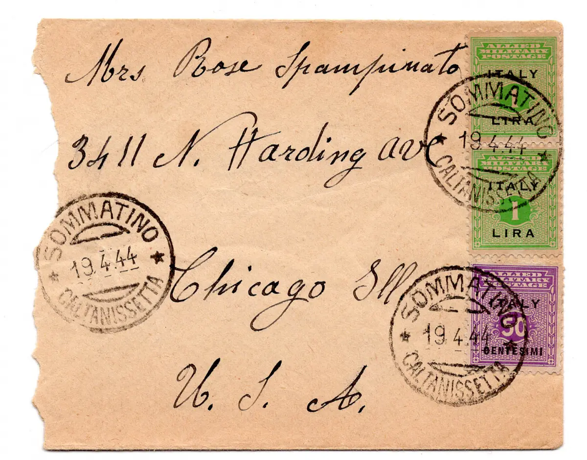 Sizilien Occ. Alliierte - Lire 1 Paar + Ergänzung auf Sommatino-Umschlag - Sizilien Occ. Alliierte - Lire 1 Nr. 6 Paar + Ergänzung Nr. 4 auf Umschlag von Sommatino nach Chicago am 19.4.44 - Umschlag links zum Öffnen gerissen, aber trotzdem mit kompletten Annullierungen - Interessant im Auslandstarif - Kat. 450 n. 1170/20