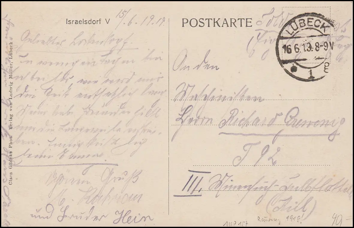 Soldatenpost an Maschinisten III. Minensuch-Halbflottille T 92,LÜBECK 16.6.1919