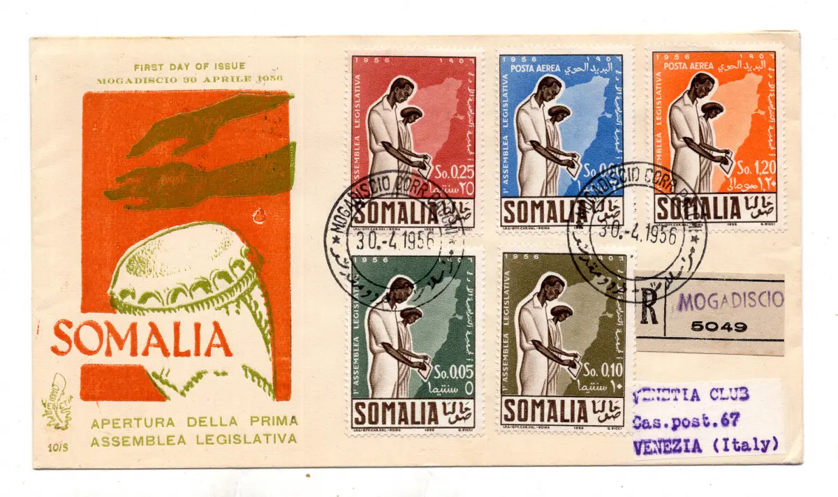 Somalia AFIS FDC Venetia 1956 Ass. Reiseresetz. Racc. Italien Somalia AFIS 1956 Gesetzgebende Versammlung auf FDC Umschlag gereist Racc. für Italien mit Annullierung der Ankunft - Abreise Stornierung Mogadischu Cod. 1654/Venetien