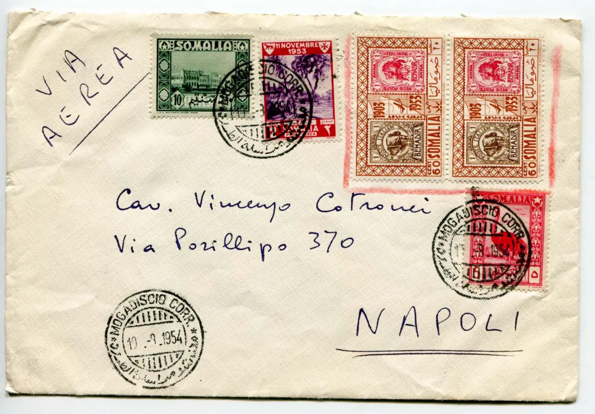 Somalia Afis - Luftpost Lebbrosari 2 sh. auf Umschlag nach Neapel - Somalia Afis - Posta Aerea Lebbrosari 2 sh. Nr. 24 + ergänzende P.O. Nr. 2 + 5 auf Luftumschlag nach Neapel am 10.8.54 - auf dem Umschlag befinden sich auch zwei Exemplare des Cent. 60 Nr. 23 anfangs nicht gestempelt mit rotem Bleistift hervorgehoben (außer Gültigkeit??) - Interessanter Code 886/7