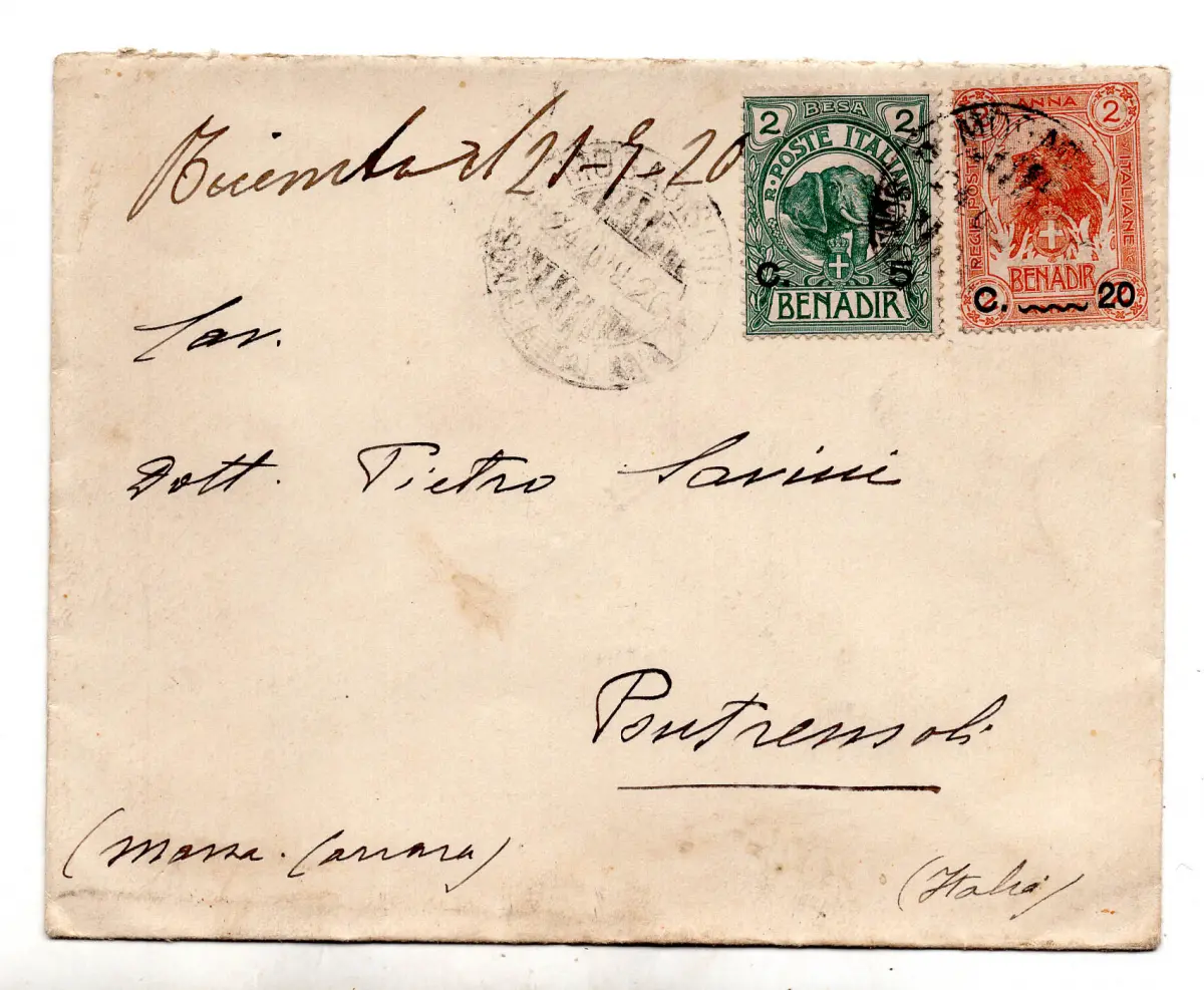 Somalia It. - Provisorische Löwen Cent. 5 von 2 + Ergänzung auf Umschlag aus Mogadischu - Somalia It. - Provisorische Löwen Cent. 5 von 2 Nr. 11 + Ergänzung Nr. 23 auf Umschlag von Mogadischu nach Pontremoli am 3.1.22 - Selten - Kat. Euro 350 Nr. 1268/20