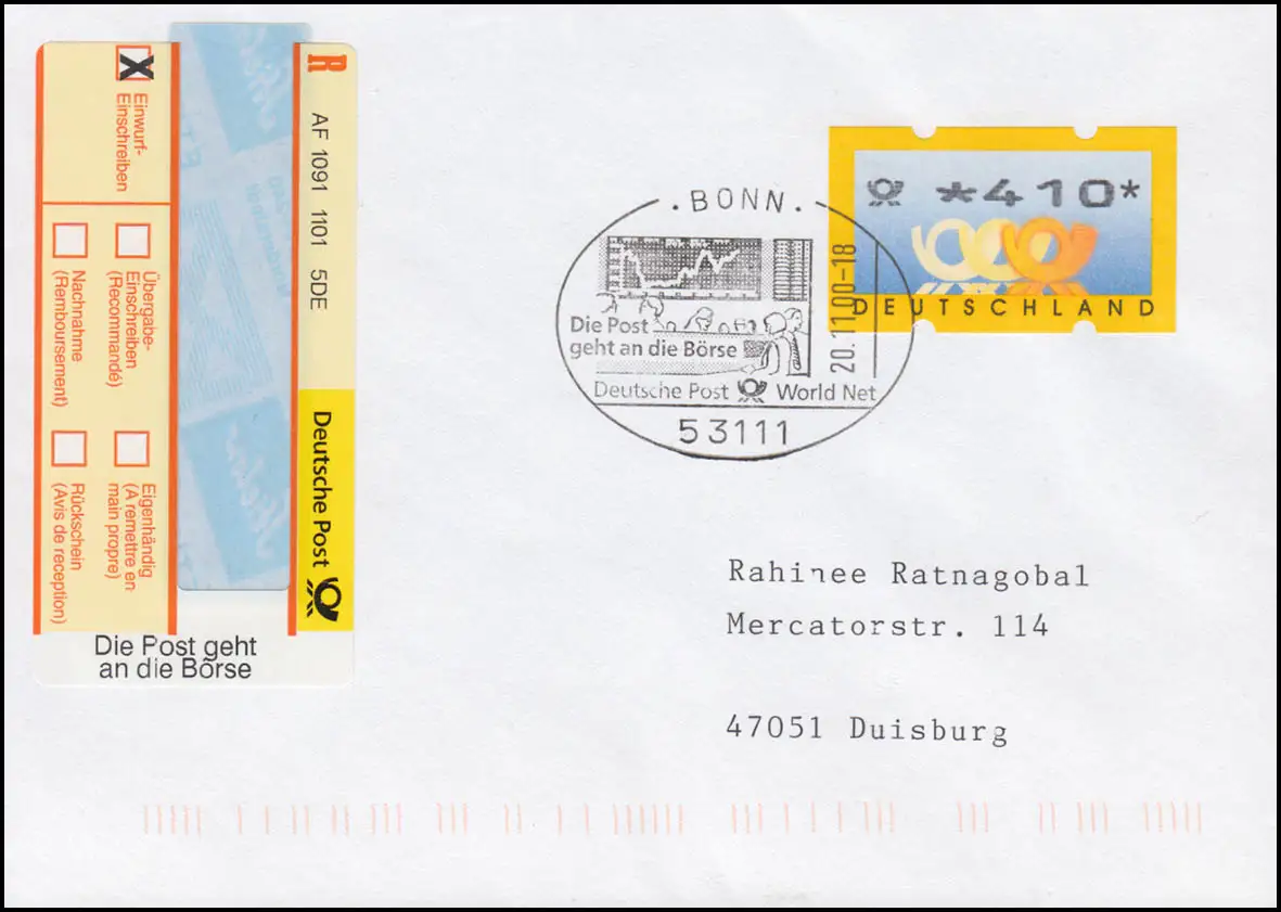 portogerechte ATM-Einzelfrankatur auf Fernbrief per Einwurfeinschreiben, Sonderstempel "BONN Die Post geht an die Börse / World Net 20.11.2000"
