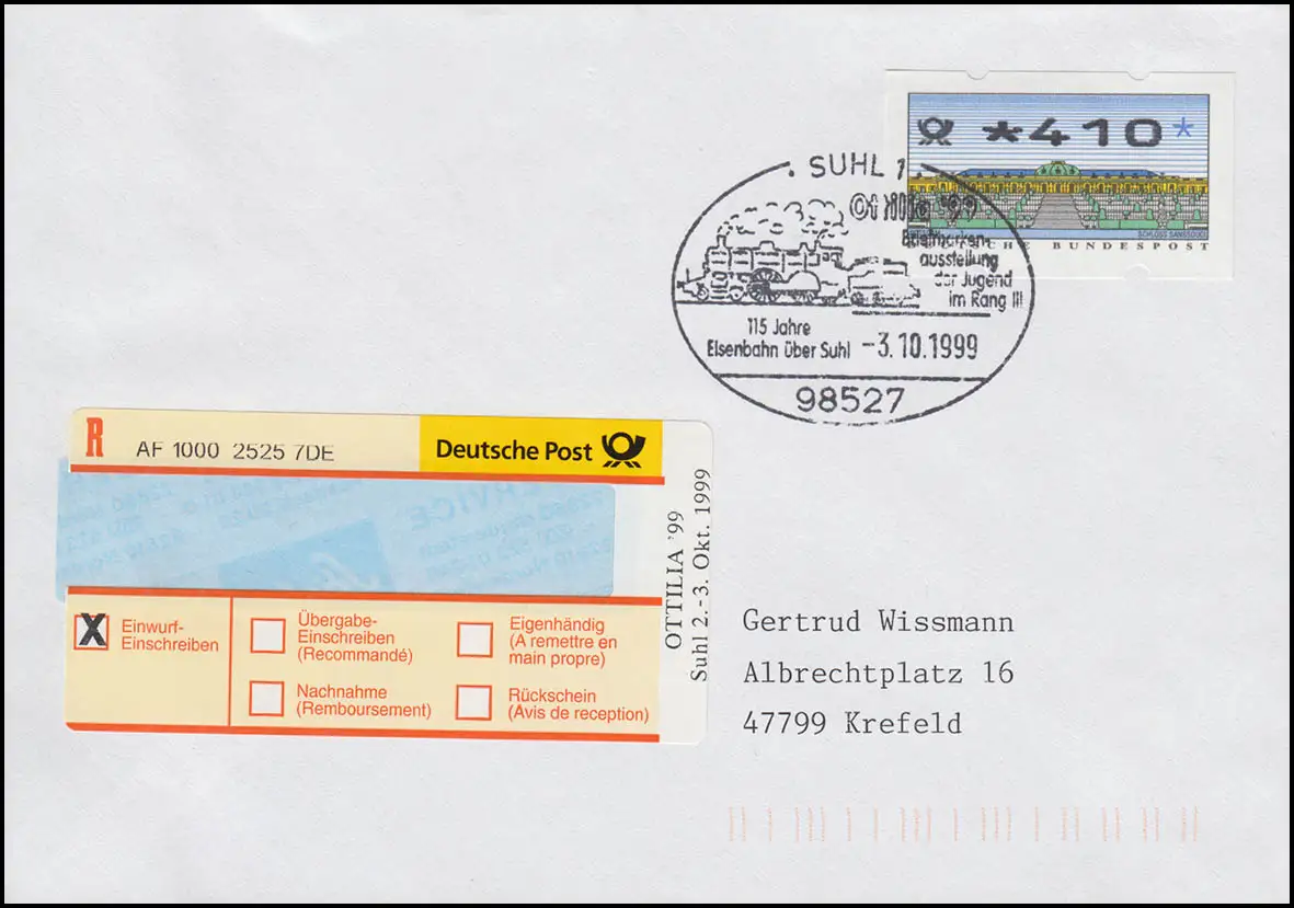 Sonder-R-Zettel OTTILA'99 Suhl auf R-Bf. mit ATM 410 passender SSt SUHL 3.10.99