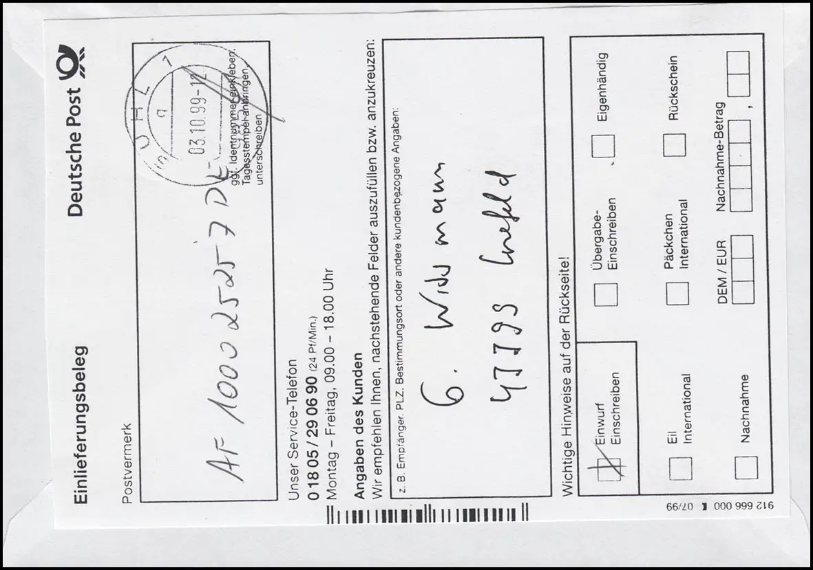 portogerechte ATM-Einzelfrankatur auf Fernbrief per Einwurfeinschreiben, mit Sonderstempel Briefmarkenausstellung SUHL 3.10.1999, Premium-Label mit vorgedrucktem Kreuz "Einwurf-Einschreiben", handschriftlicher EPOS-Quittung, codiert