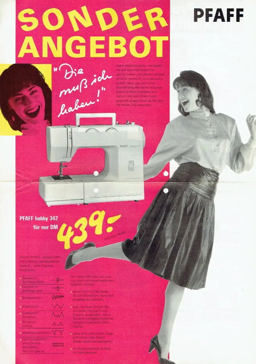 guter bis sehr guter Zustand, geringe Gebrauchs- und Alterungsspuren: gelocht, Nähmaschinen-Werbung, der Prospekt stellt einige Pfaff-Modelle mit ihren DM-Preisen vor, Papier, ca. 21 x 29,5, Doppelseite mit zahlreichen Bildern