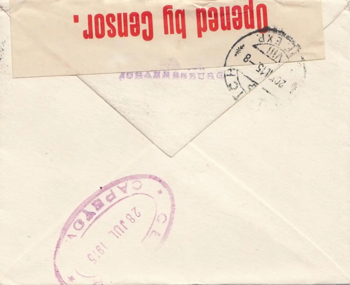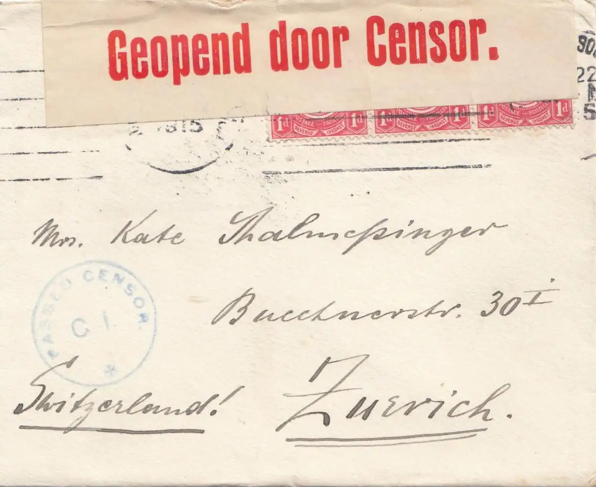 South Africa 1915: Johannesburg to Zürich, opened by censor
