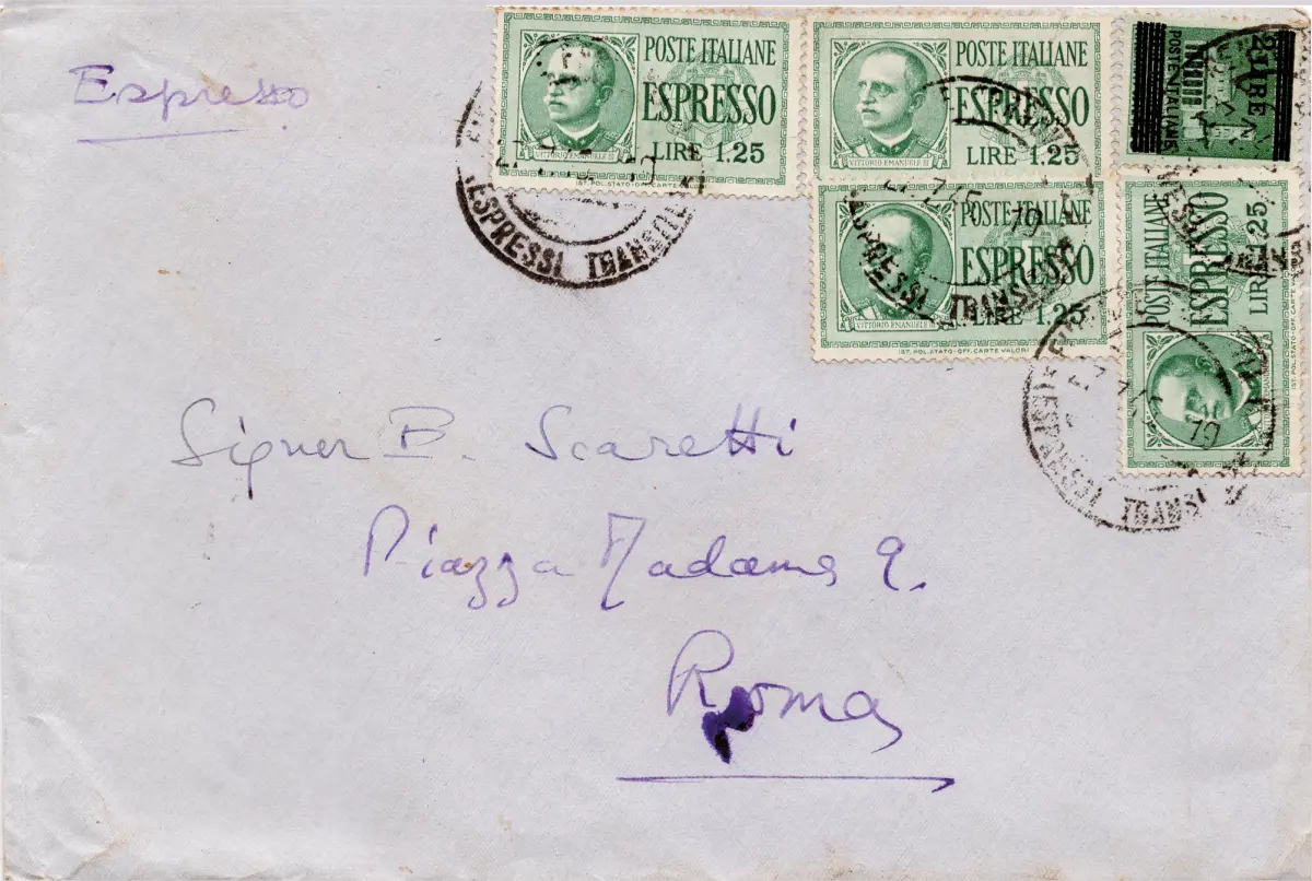 Umschlag - Späte Verwendung - Espresso Lire 1,25 Nr. 15 vier Exemplare + ergänzende P.O. Nr. 525 auf Expressumschlag von Florenz nach Rom am 27.7.45 - Seltene Mehrfachverwendung in der Statthalterzeit - Kat. euro 650 Cod. 227/17