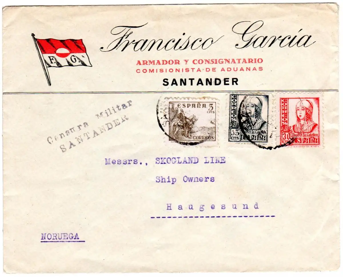 Spanien 1937, 5+15+30 C. auf Zensur Brief v. Santander n. Norwegen