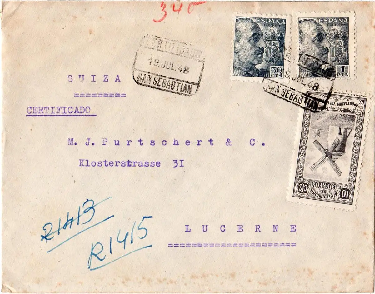 Spanien 1948, 1 P.+50 C. auf Reko Brief v. San Sebastian m. Spendenmarke