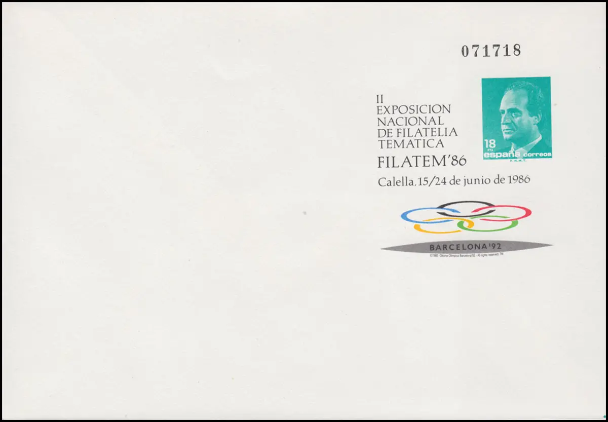 Spanien Sonderumschlag 18 Pta Ausstellung FILATEM'86 und OLYMPIA'92, ungebraucht