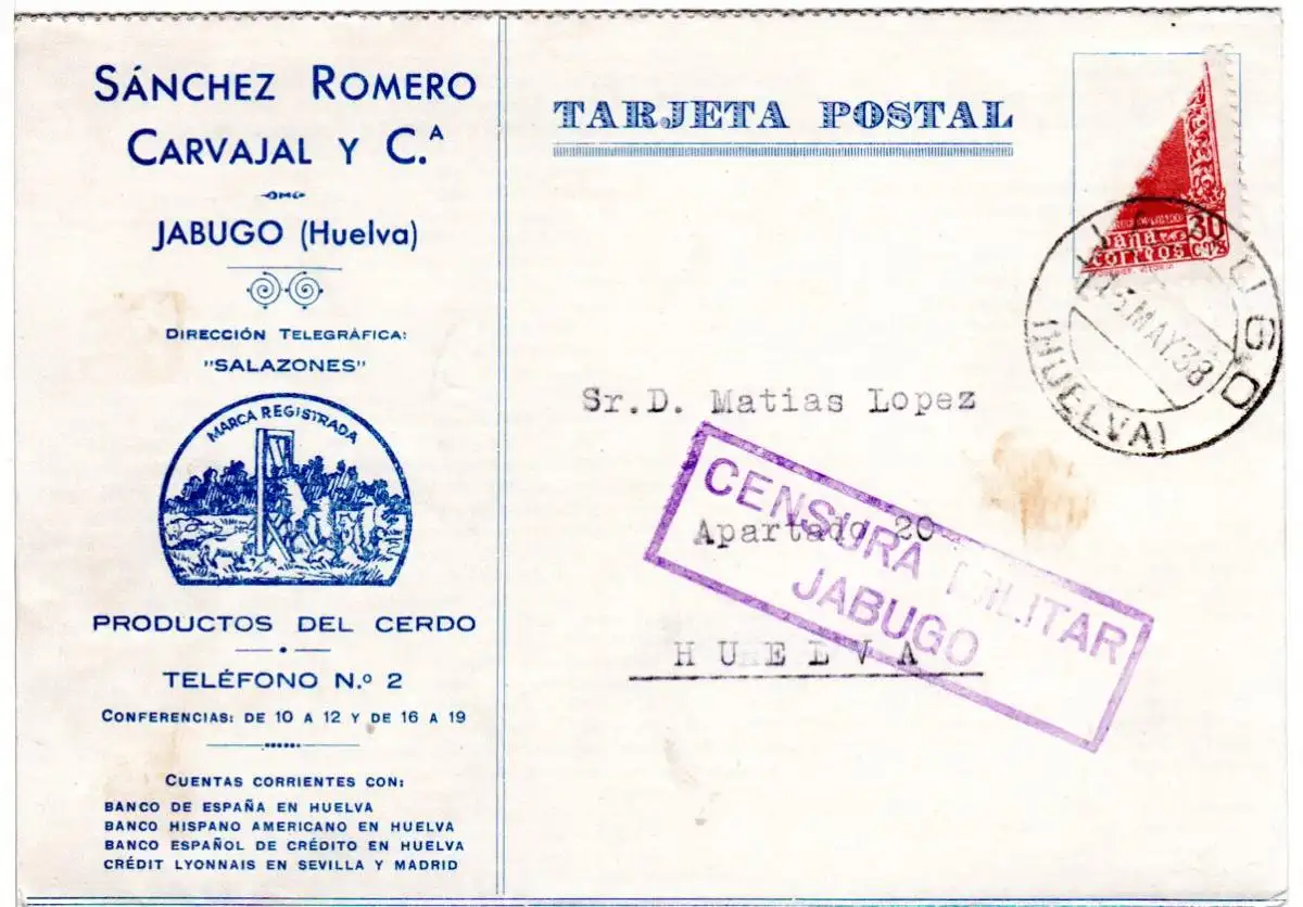 Spanien1938, Halbierung 30 C. auf Firmen Zensur Karte v. Jabugo