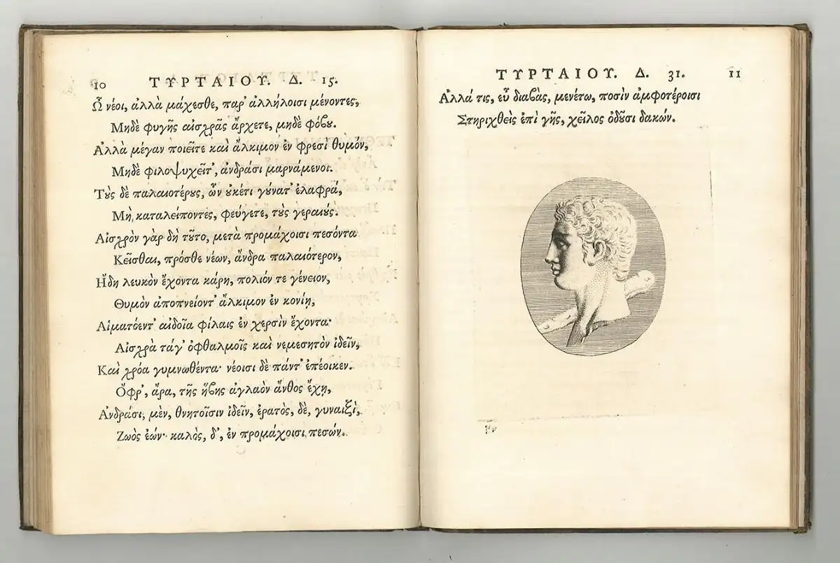 Bemerkungen: BM English Short Title Catalog, T136314 - Von James Moor (1712-1779), Professor für Griechisch and der Universität von Glasgow, mit einer biographischen Einleitung versehene Ausgabe der militärischen Lieder und Verse des Elegiendichters Tyrtaios (7. Jhdt. v. Chr.), die während des 2. Messensichen Krieges entstanden sein dürften. Die vorliegende seltene Ausgabe enthält eine gedruckte Widmung: "These remains of ancient panegyric on martial spirit and personal valour, of old, the daily lessons of the spartan youth, are, with propriety, inscribed to the young gentleman, lately, bred at the university of Glasgow, at present serving their country as officers of the Highland Battalions now in America". Mit 2 Kupferstich-Portraitmedaillons. Text in englischer und altgriechischer Sprache.