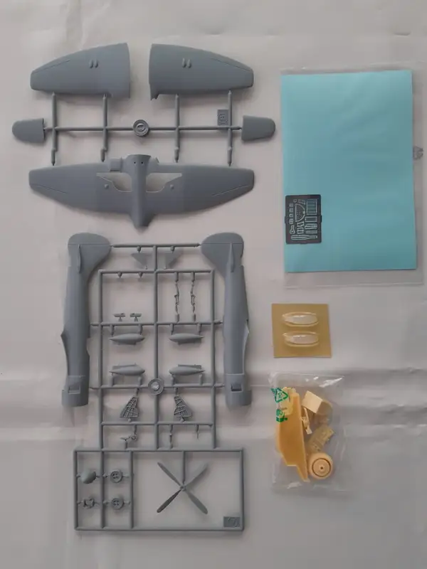 Einzelteile (Plastikbauteile) sind noch am Rahmen fixiert; Sichthülle wurde geöffnet.