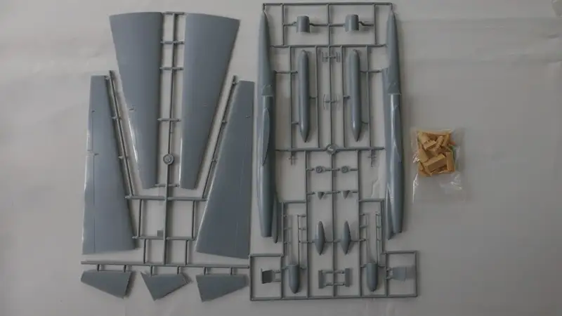 Einzelteile (Plastikbauteile) sind noch am Rahmen fixiert, Sichthülle wurde geöffnet.