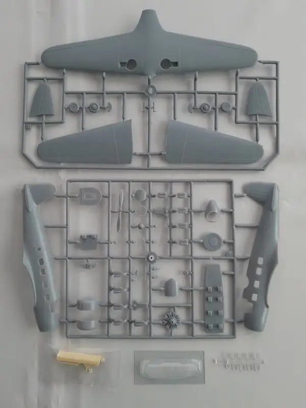 Einzelteile (Plastikbauteile) sind noch am Rahmen fixiert; Sichthülle wurde geöffnet.