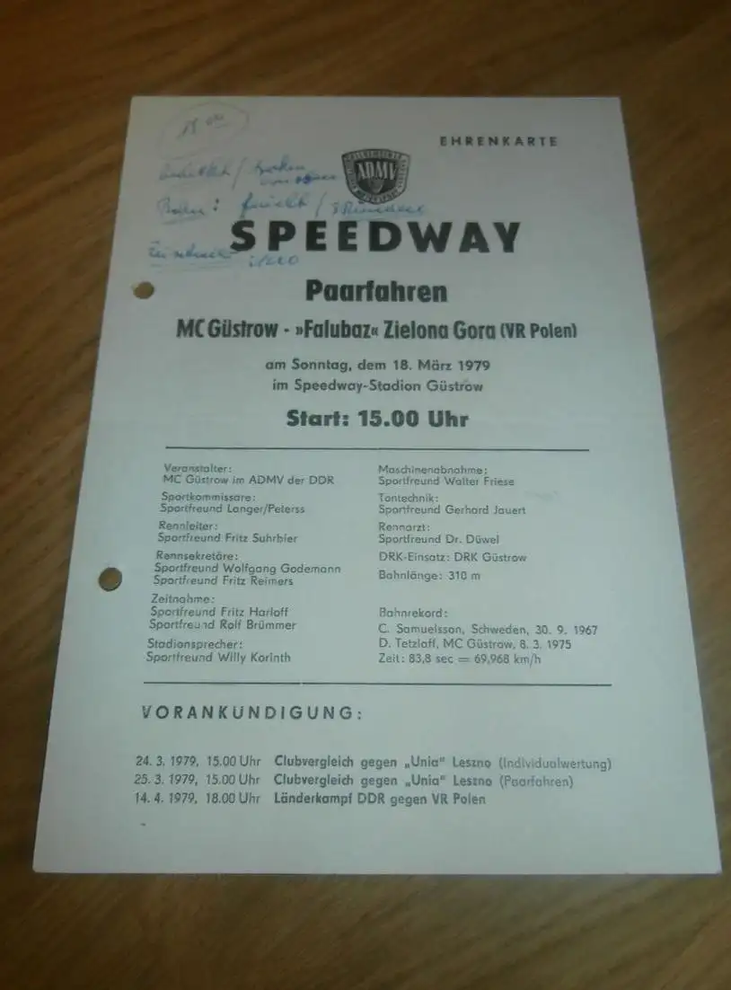 Speedway Güstrow 18.03.1979 , Falubaz Zielona Gora , Programmheft / Programm / Rennprogramm , program !!!