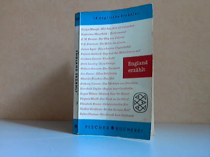 England erzählt; Achtzehn Erzählungen; Hilde Spiel; E. M. Forster; Der Weg von Colonos; James Joyce; Ein schwerer Unglücksfall; Katherine Mansfield; Entkommen!; Virginia Woolf; Der Fleck an der Wand; Graham Greene; Unschuld; Evelyn Waugh; Wer hat, dem wird gegeben; V. S. Pritchett; Die Höhle des Löwen; Elizabeth Bowen; Geheimnisvolles Kor; William Sansom; Der Tanzsaal; Elizabeth Taylor; Beginn einer Geschichte; Angus Wilson; Mutters Sinn für Humor; Dylan Thomas; Ein Besuch beim Großvater; Doris Lessing; Lucy Grange; Nadine Gordimer; Ist das die neue Ära?; Maurice Rowdon; Das Mal - Patrick Garland; Leg mal den Weltschmerz auf; Jan Carew; Tihos Bekehrung; Anthony Carson; Das Mädchen aus Barcelona