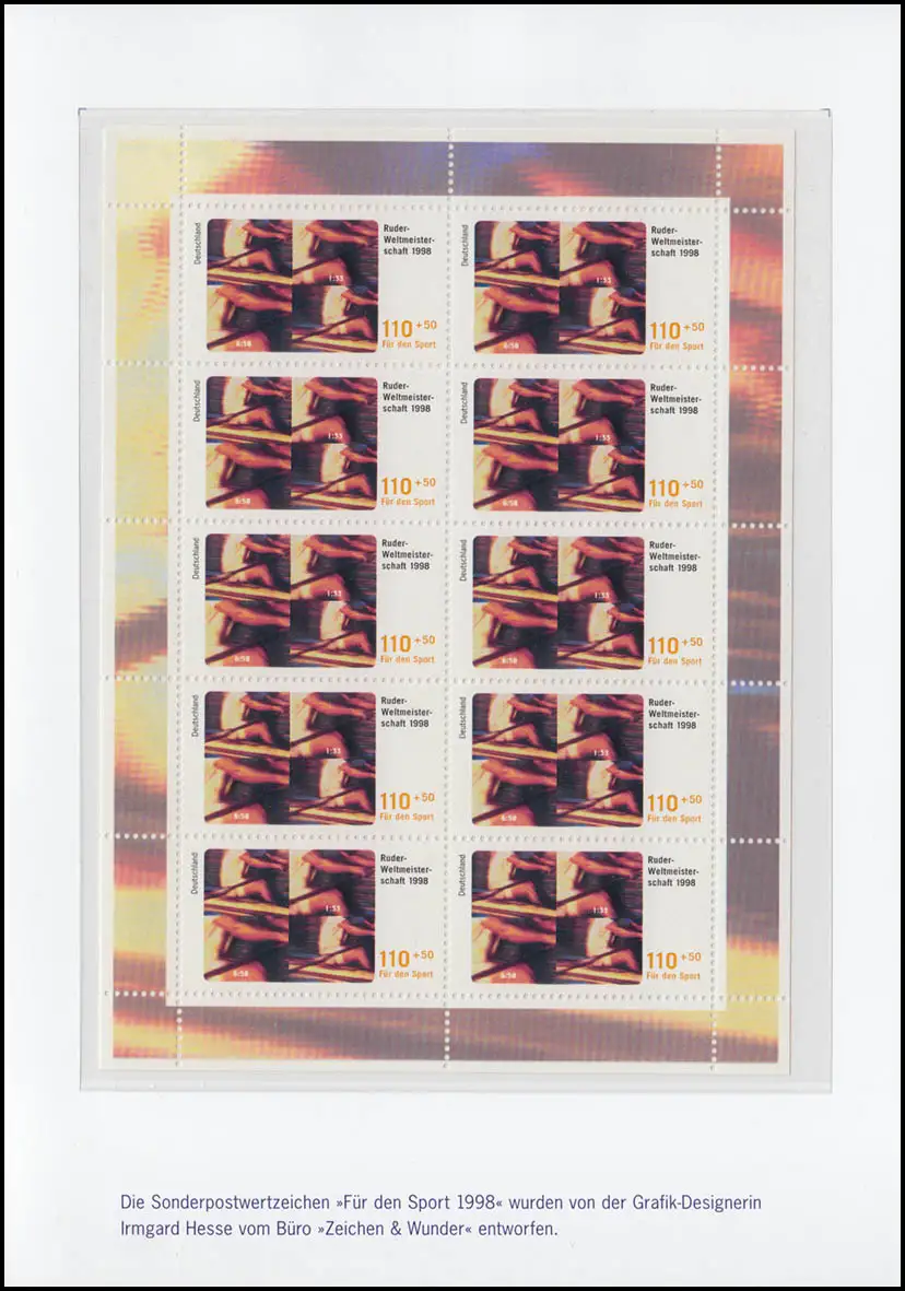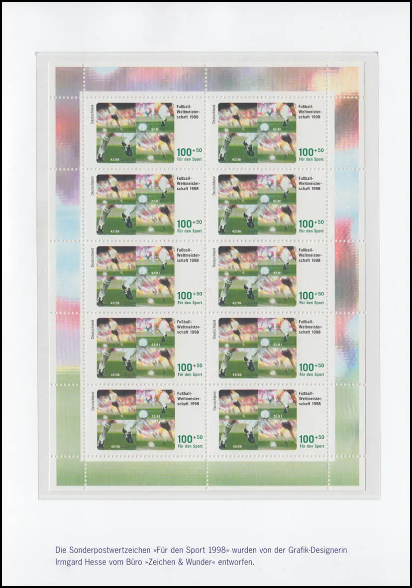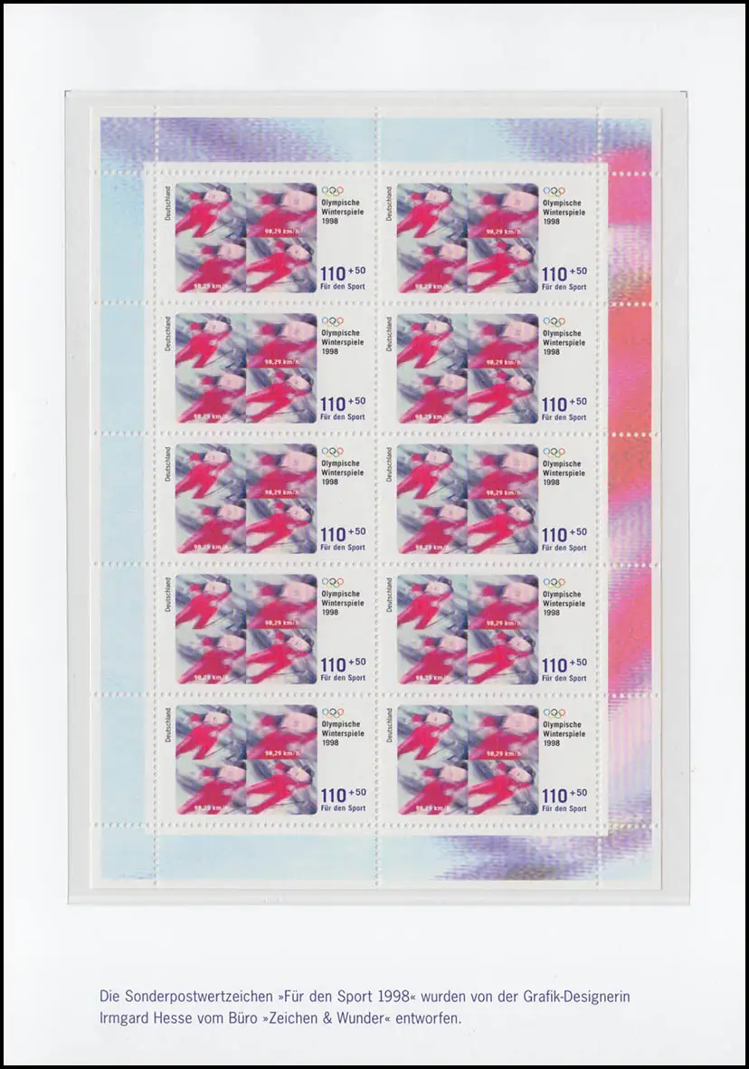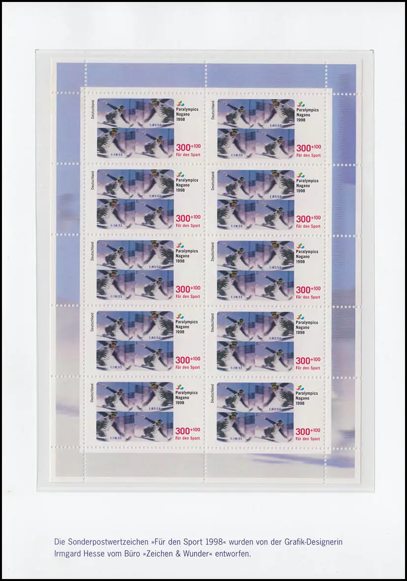 Offizielle Folder der Stiftung Deutsche Sporthilfe "30 Jahre Sportbriefmarken": Fußball-WM Frankreich, Olympia Winterspiele Nagano, Ruder-WM Köln, Winter-Paralympics Nagano (Fußball, Skispringen, Rudern, Riesenslalom)
