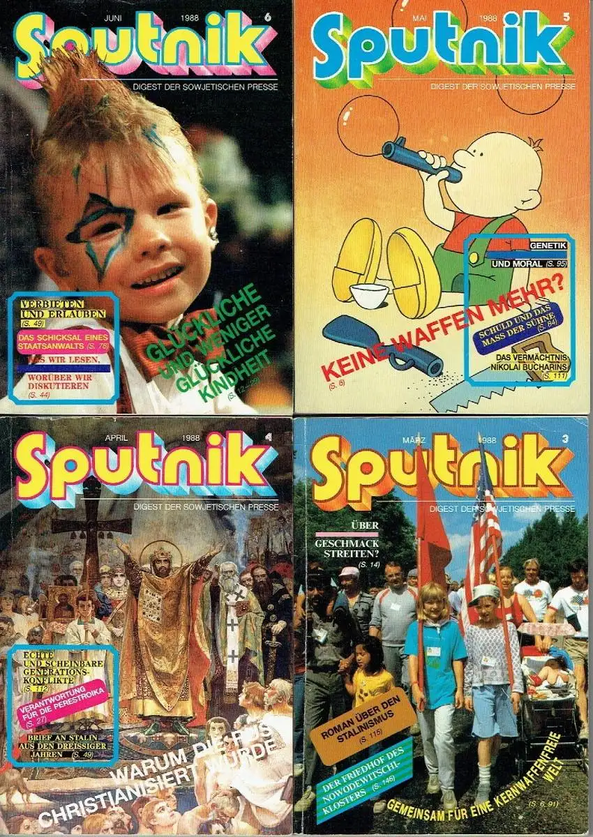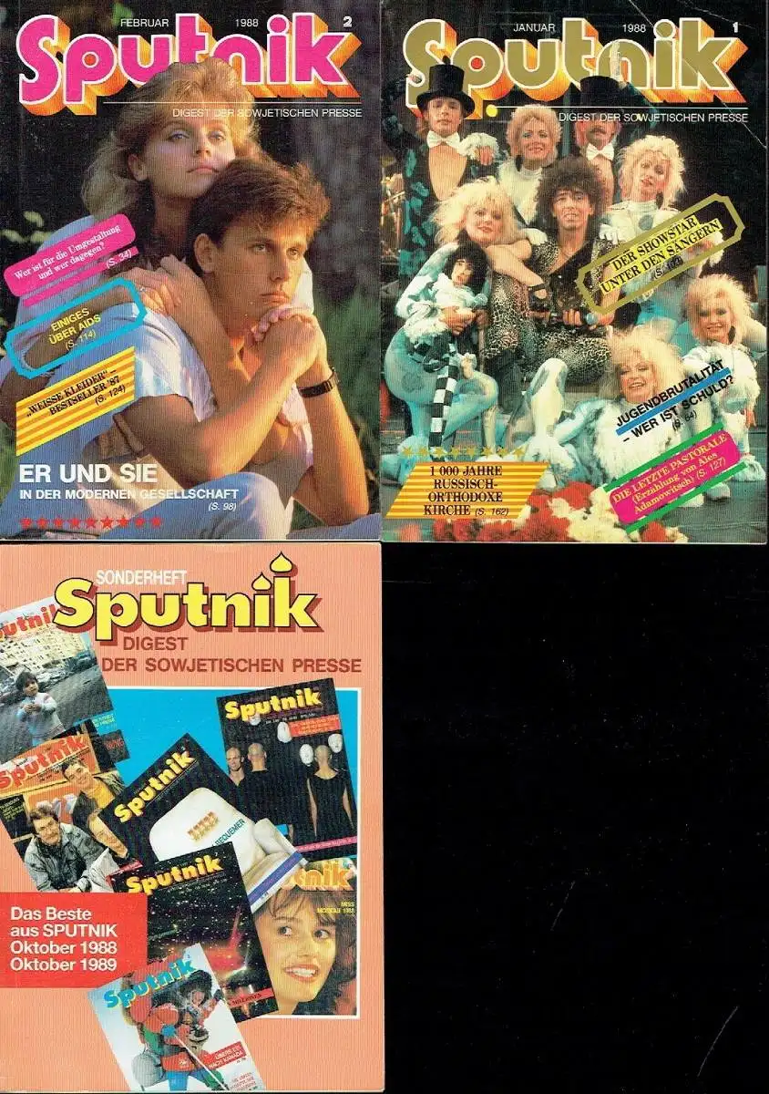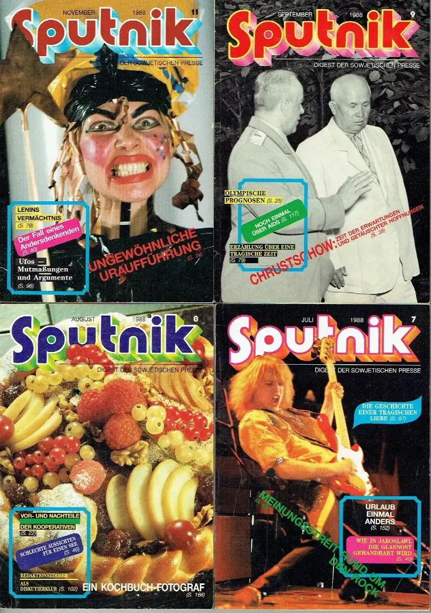 guter bis sehr guter Zustand, geringe Gebrauchs- und Alterungsspuren: gelegentlich kleinere Blessuren - 5 Rückseiten mit Adressaufkleber, Sie erhalten folgende 11 Hefte: - 1988: 1-9, 11 - Sonderheft Das Beste aus Sputnik Oktober 1988 bis Oktober 89 Die Zeitschrift Sputnik (russisch: Begleiter) wurde 1967 gegründet und von der sowjetischen Nachrichtenagentur Nowosti in mehreren Sprachen herausgegeben. Zielgruppe war das sozialistische und westliche Ausland. Sie diente bis etwa 1991 als publizistischer Botschafter der Sowjetunion. Sputnik verstand sich als Digest der sowjetischen Presse und führte dies auch als Untertitel. Entsprechend erschienen Artikel aus allen Bereichen von Politik, Kultur, Wissenschaft und Gesellschaft, meist durchgehend mit farbigen Illustrationen und Fotos sowie von redaktionellen Beiträgen kommentiert. Die kulturelle Vielfalt der verschiedenen Nationalitäten und der regionalen geografischen und klimatischen Verhältnisse des Landes wurde dokumentiert. Auch ein Russisch-Kursus war Bestandteil. Die Zeitschrift war im Kleinformat auf Hochglanzpapier gedruckt und broschiert. Sie wurde zum Teil in Finnland gedruckt. Da die Zielgruppe auch im Westen lag, bemühte sich die Redaktion, auf ein Übermaß sozialistischer Rhetorik zu verzichten und, in begrenztem Umfang, auch leicht systemkritische Aspekte einzubringen. Die deutschsprachige Ausgabe wurde sowohl in der DDR als auch in der Bundesrepublik vertrieben. Besonders beliebt waren auch die Radio-Jerewan-Witze, die häufig Schwächen des Sozialismus aufs Korn nahmen. Im Zuge der Glasnost- und Perestroika-Politik des KPdSU-Generalsekretärs Michail Gorbatschow nahm die kritische Berichterstattung auch in der Zeitschrift Sputnik zu. Die DDR-Bürger erfuhren dadurch über die politischen Umwälzungen in der Sowjetunion und lasen über Verbrechen Stalins, der mit Hitler verglichen wurde. Bislang verfemte Künstler wurden in Sputnik-Artikeln rehabilitiert, sodass die Zeitschrift in der DDR immer begehrter wurde. Die SED-Führung irritierten besonders einige Artikel über Stalin, der in ihrer Sicht immer ein strikter Gegner der NS-Diktatur war. Als Sputnik im Herbst 1988 über den deutsch-sowjetischen Nichtangriffspakt vom 24. August 1939 berichtete, geriet diese offizielle Sicht ins Wanken.Daher unterband die DDR-Regierung am 18. November 1988 die Auslieferung der Zeitschrift durch den Postzeitungsvertrieb (DDR), was praktisch auf ein Verbot hinauslief. Die SED-Zeitung Neues Deutschland brachte dazu am 19. November unter der Überschrift „Mitteilung der Pressestelle des Ministeriums für Post- und Fernmeldewesen“ folgende Meldung: „Berlin (ADN). Wie die Pressestelle des Ministeriums für Post- und Fernmeldewesen mitteilt, ist die Zeitschrift ‚Sputnik‘ von der Postzeitungsliste gestrichen worden. Sie bringt keinen Beitrag, der der Festigung der deutsch-sowjetischen Freundschaft dient, stattdessen verzerrende Beiträge zur Geschichte.“ Eine weitergehende Begründung gab es nicht. Es wurde noch darauf verwiesen, dass der Sputnik kein Organ der sowjetischen Regierung sei und deshalb auch nicht die Sowjetunion angemessen repräsentieren könne. Die Ausgabe 10/1988 hatte erstmals unter der Überschrift Stalin und der Krieg über den von der SED geleugneten deutsch-sowjetischen Nichtangriffspakt berichtet. Die wachsende Opposition in der DDR bezeichnete die Reaktion der SED als Verbot.Mit ihrer Reaktion heizte die SED-Führung den Unmut in der DDR und sogar in der Partei weiter an. Das Wort „Sputnik“ – auf Flugzetteln oder als Inschrift – wurde zum Synonym für die Unterdrückung der Meinungs- und Pressefreiheit durch die SED und ihre Darstellung zur Rolle Stalins.Die oppositionellen Umweltblätter berichteten im Dezember 1988 von Protesten gegen die SED-Reaktionen, die auch fünf aktuelle sowjetische Filme betraf, und druckten die wichtigsten Beiträge der Monatszeitschrift nach. Ein Beitrag diskutierte die Frage „Hätte es ohne Stalin Hitler gegeben?“ Der Schwerpunkt lag auf Beiträgen zu Stalin, seiner Diktatur, seinen Gefolgsleuten und den Folgen. Auch an seinem prominenten Nachfolger Leonid Breschnew wurde Kritik geübt. Beim Lesen der Artikel wurde deutlich, warum das SED-Politbüro dies seinen Bürgern vorenthalten wollte. Die Parallelen zur eigenen Machtpraxis waren unübersehbar.Ende 1989 erschien ein Sonderheft Das Beste aus SPUTNIK Oktober 1988 – Oktober 1989, das „in erster Linie für diejenigen Leser (…) bestimmt (ist), denen es nicht möglich war, in diesem Zeitraum unsere Zeitschrift zu lesen“ (Vorspann)." (Wikipedia), Softcover, ca. 13,5 x 19, je ca. 175 Seiten mit zahlreichen Bildern